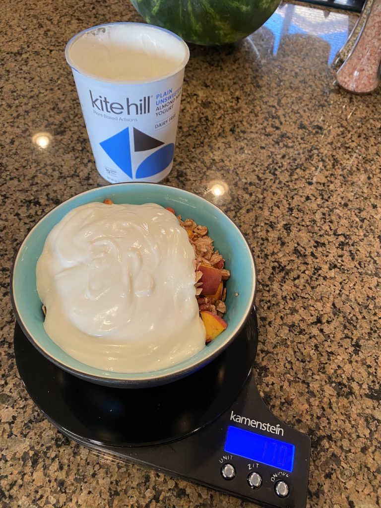 The peaches are from Trader Joe’s (this time, but I usually get them from Costco), the granola from Costco, and the yogurt from Whole Foods. Getting groceries from 3+ different stores is pretty normal for a vegan, and fortunately all of these stores are close to us.