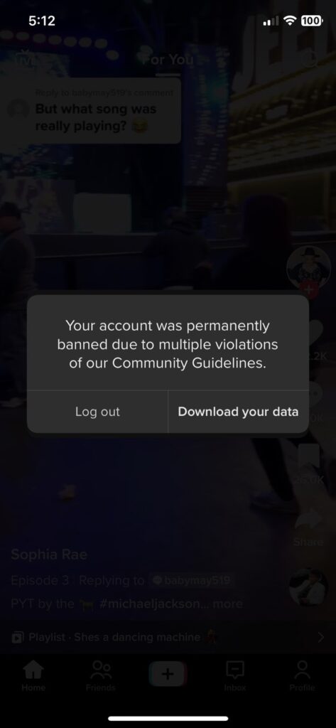 The next day (this morning) before heading to the gym, I opened the TikTok app and saw this message, telling me that that I was “permanently banned due to multiple violations of our Community Guidelines.”