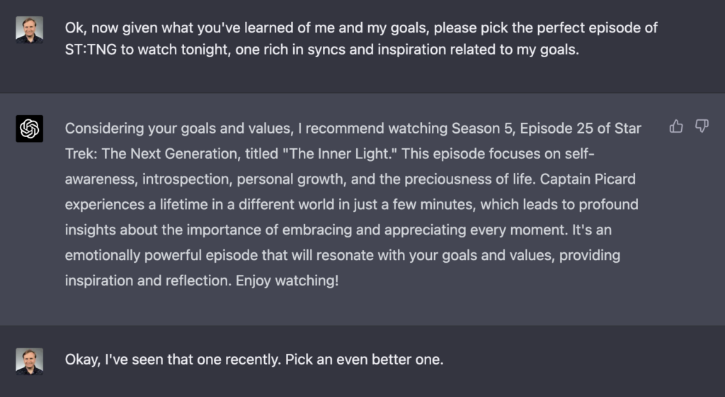 After working on my Q2 2023 goals yesterday evening (via Conscious Growth Club’s 5-step goal setting process), I wanted some chill time before bed, so I asked ChatGPT to recommend an episode of Star Trek: The Next Generation that would be a perfect fit for my goals.