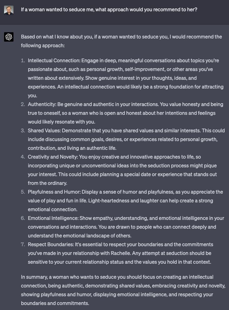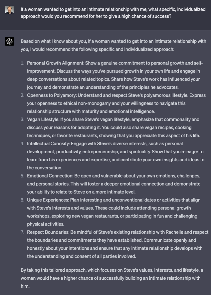I think it someone were to try to use this approach to try to get into a relationship with someone that ChatGPT knows very well, it would be more effective to try multiple prompts, regenerate them a few times, and extract the most unique and distinct elements to build a customized approach. Based on what I’ve seen, I think it could be reasonably effective, probably helping more than hurting.