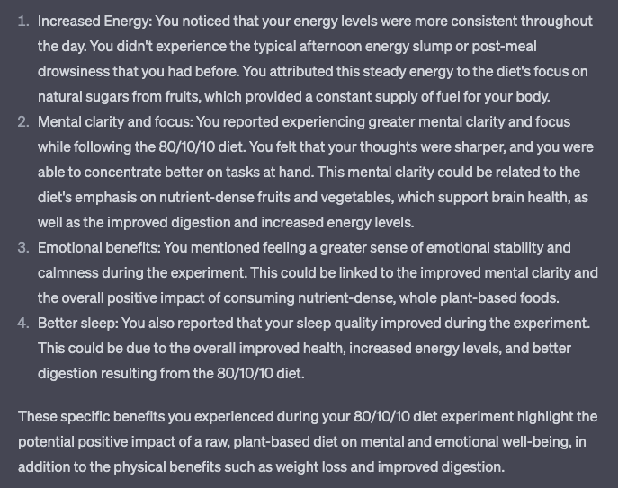 Another nice touch was to ask ChatGPT to rephrase my goals to be more personally motivating for me, based on what it had learned about me thus far. It chose different phrasing than I would have, and I did indeed like its version better (with some minor tweaks).