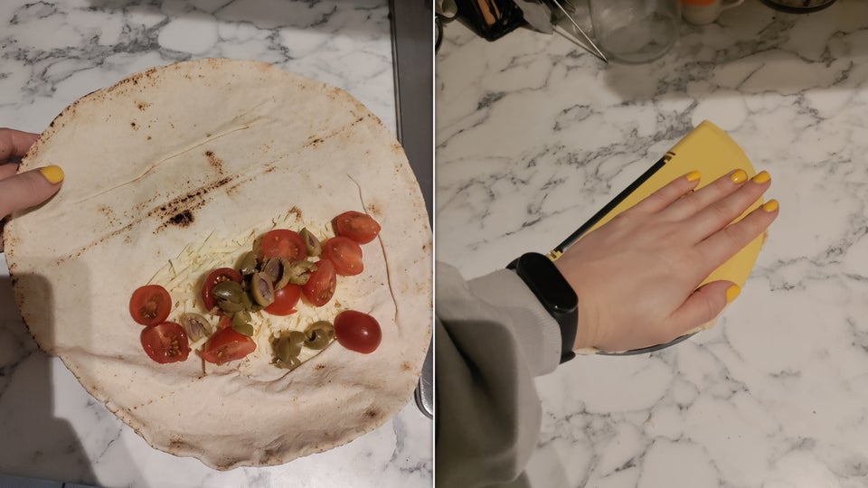 Once I pushed the lid of the gadget down on the just-warmed wrap, I held it there for about ten seconds.